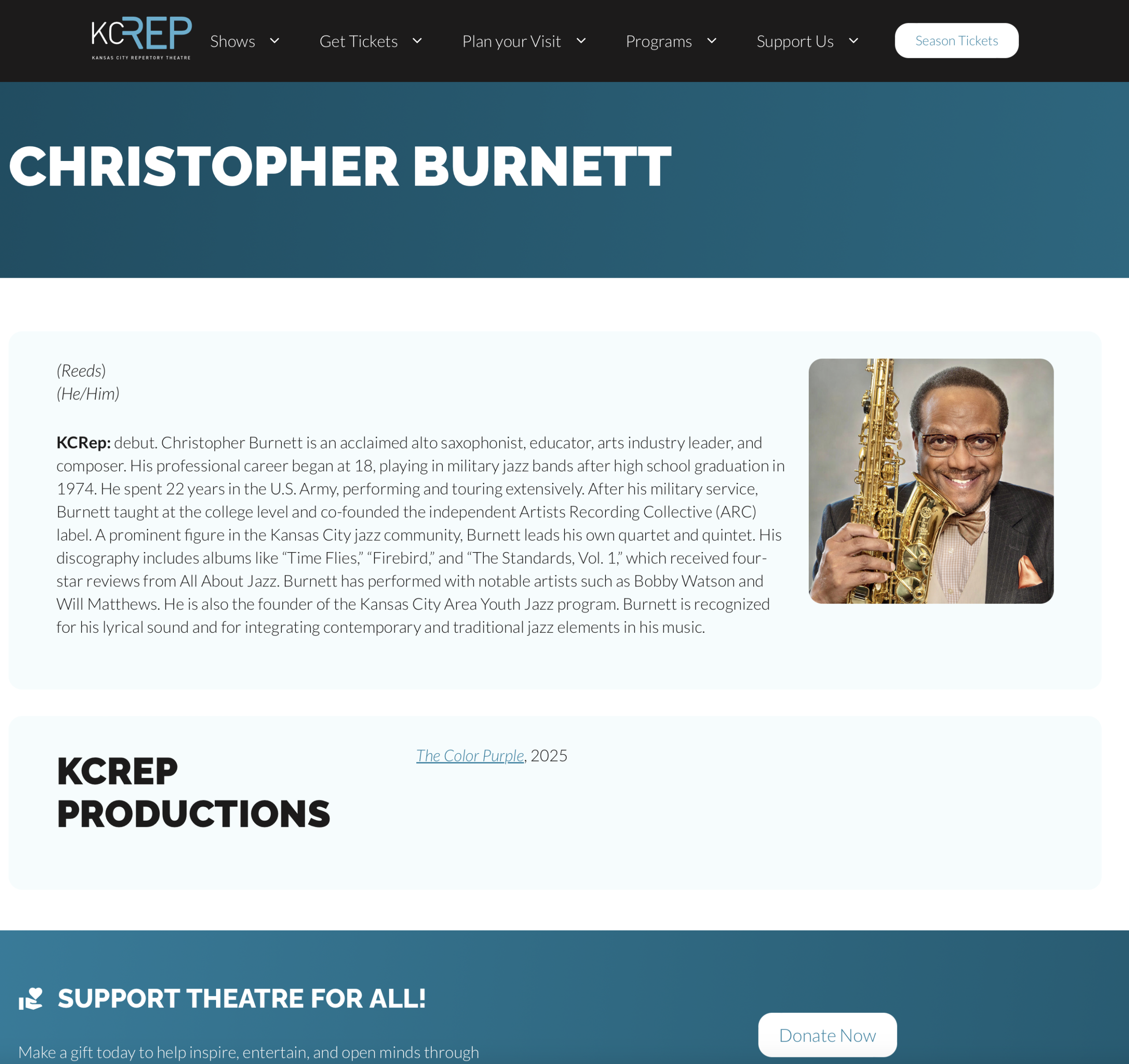 2025: Christopher Burnett was hired by Pamela Baskin-Watson to play the Reed 1 Book for the critically acclaimed and publicly well-received Kansas City Repertory Theatre production of “THE COLOR PURPLE”.